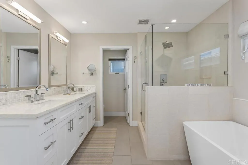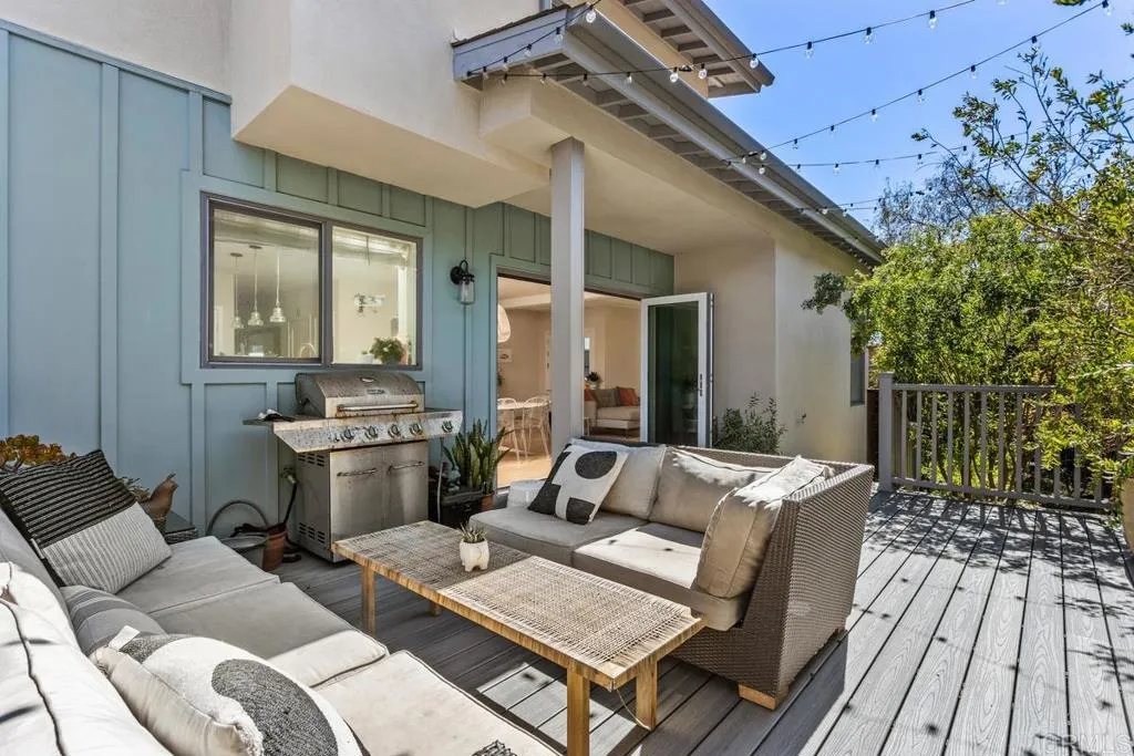 Sun, Sand, and Style: Modern Beach Cottage: Newly built in 2017 and offering a coastal contemporary vibe, this high-end home just moments from the ocean in Leucadia offers a modern twist on beach-close living. Wrapped in stylish board-and-batten siding, the home is introduced by a bright red front door that opens to a spacious two-level interior of approximately 1,963 square feet. Flowing via glass accordion doors to a large deck that is primed for outdoor entertaining, the main floor showcases and open-concept great room, dining room and kitchen area complete with high ceilings and wide-plank white oak wood flooring. Arranged for both easy meal prep and fabulous entertaining, the open kitchen shines with top-tier stainless steel appliances, a large island for casual meals, white Shaker cabinetry, a full tile backsplash and a pantry. Three bedrooms and two- and one-half baths include a boutique hotel-caliber primary suite with a vaulted ceiling, intimate balcony, versatile retreat, frameless shower enclosure, a soaking tub, two sinks and a walk-in closet. Only the best finishes and craftsmanship are on display throughout the residence, which includes a laundry room and an attached two-car garage. The location makes it easy to explore Beacons Beach, coffee shops, restaurants and shops.